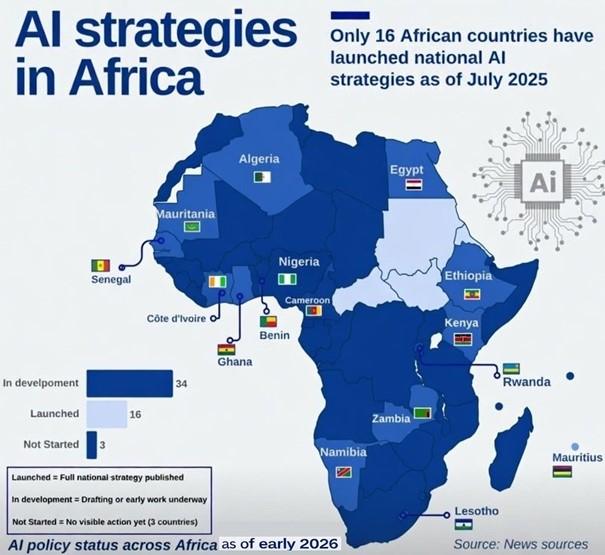 To date, only 16 African countries have officially launched a national artificial intelligence strategy, while 34 others are in the process of developing policies and a few have not yet begun this process. Among the most advanced countries are Egypt, Algeria, Kenya, Rwanda, Ghana, Senegal, Morocco, Tunisia, South Africa, and Nigeria. These states are laying the groundwork for AI governance and seeking to structure their digital ecosystems.